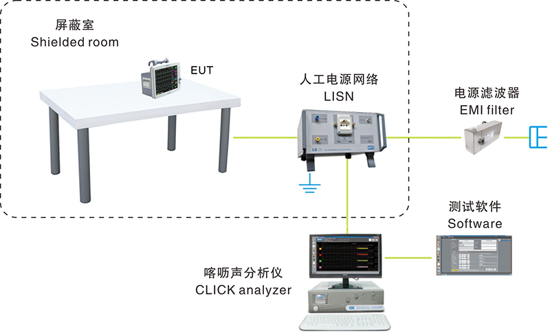 喀嚦聲屬于傳導(dǎo)騷擾測(cè)試,測(cè)試端口與傳導(dǎo)連續(xù)騷擾一致。喀嚦聲測(cè)試需要哪些測(cè)試設(shè)備呢?下圖是我司推薦的喀嚦聲測(cè)試的標(biāo)準(zhǔn)方案,由于喀嚦聲測(cè)試對(duì)信號(hào)的采集、分析與連續(xù)騷擾不同,故常規(guī)的接收機(jī)已不能滿足喀嚦聲測(cè)試要求,這里我們就需要用到喀嚦聲分析儀。在耦合單元方面喀嚦聲測(cè)試與連續(xù)騷擾還是一致的,常規(guī)電源端口使用LISN,信號(hào)端、負(fù)載端和高壓大電流電源端使用電壓探頭。測(cè)試環(huán)境需要使用屏蔽室環(huán)境。