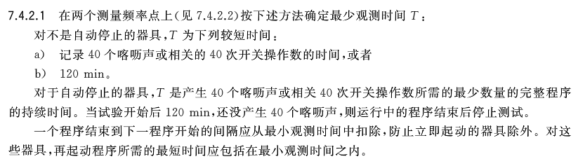 標(biāo)準(zhǔn)上根據(jù)設(shè)備的運(yùn)行狀態(tài),將設(shè)備分為兩類:一種是一直運(yùn)行的設(shè)備,另一種是自動(dòng)停止的設(shè)備。當(dāng)設(shè)備是一直運(yùn)行的設(shè)備如冰箱,當(dāng)設(shè)備運(yùn)行120min還未觀測(cè)到40個(gè)喀嚦聲或者40次開關(guān)次數(shù),則測(cè)試停止,或者在120min中之內(nèi)也觀測(cè)到40個(gè)喀嚦聲或者40次開關(guān)次數(shù),則測(cè)試停止。當(dāng)設(shè)備是自動(dòng)停止的設(shè)備如洗衣機(jī),判定依據(jù)還是一致的,我們需要保證觀測(cè)時(shí)間內(nèi)包含最小數(shù)量的完整程序且一個(gè)程序結(jié)束和下一個(gè)程序開始的間隔是需要扣除的。