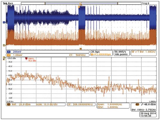 你還需要查看巧合性。待測設備(DUT)上的哪個信號與EMI事件是同時發生的?一般常見的做法是用示波器探測DUT上的電氣信號。檢查EMI問題與電氣事件的巧合性無疑是EMI排查中最耗時間的工作。過去,將來自頻譜分析儀和示波器的信息以同步方式關聯在一起一直是很難做的一件事。